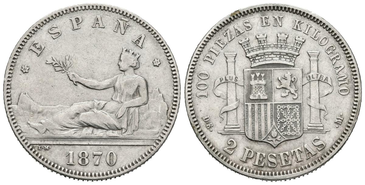 PROVISIONAL GOVERNMENT (1868-1871). 2 Pesetas. (Ar. 10.00g / 27mm). 1870 * 18-74. Madrid DEM. (Cal-2019-31). VF.