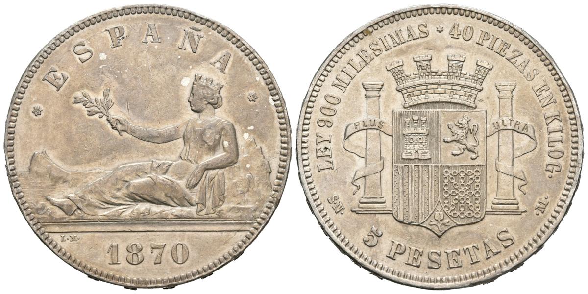 PROVISIONAL GOVERNMENT (1868-1871). 5 Pesetas. (Ar. 24.82g / 37mm). 1870 * 18-70. Madrid SNM. (Cal-2019-39). VF/ XF.