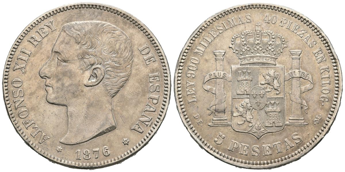 ALFONSO XII (1874-1885). 5 Pesetas. (Ar. 24.85g / 38mm). 1876 * 18-76. Madrid DEM. (Cal-2019-37). Striped ear. AU/ XF.