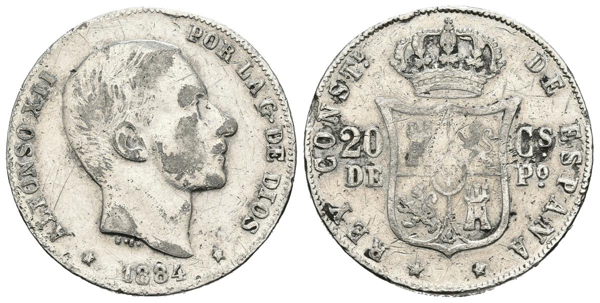 ALFONSO XII (1874-1885). 20 cents. (Ar. 4.72g / 23mm). 1884. Manila. (Cal-2019-110). BC +. Cleaned.
