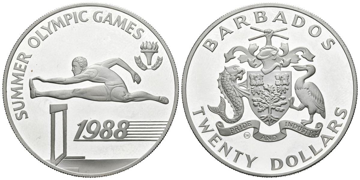 English BARBADOS. 20 Dollars. (Ar. 23.42g / 39mm). 1988. Olympic Games Seoul 1988. (Km # 49). PROOF.