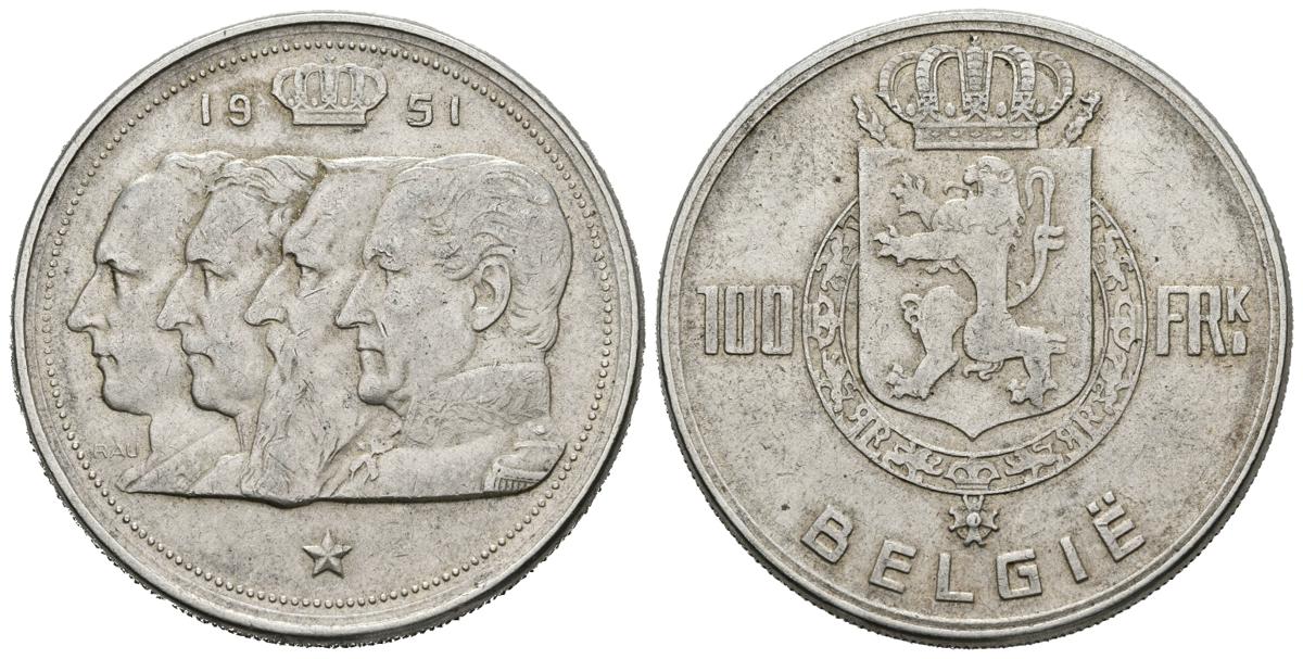 BELGIUM. 100 Francs (Ar. 18.12g / 33mm). 1951. België in Flemish (Km # 139.1). VF.