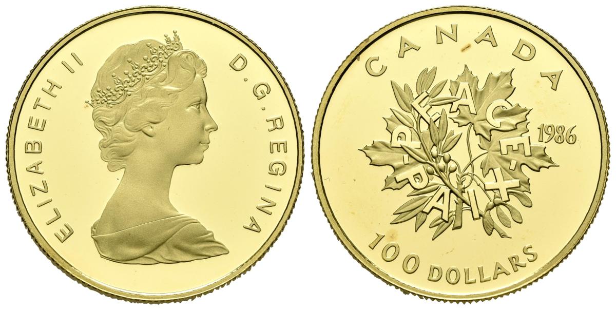 CANADA. 100 Dollars (Au. 16.99g / 27mm). 1986. International Year of Peace. (Km # 152). Proof. Includes certificate of authenticity and original box.