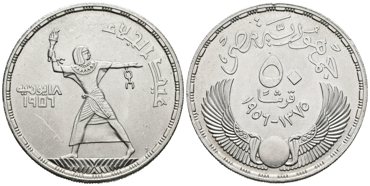 EGYPT. 50 Piastres. (Ar. 28.01g / 40mm). 1956. Gamal Abdel Nasser. (Km # 386). XF.