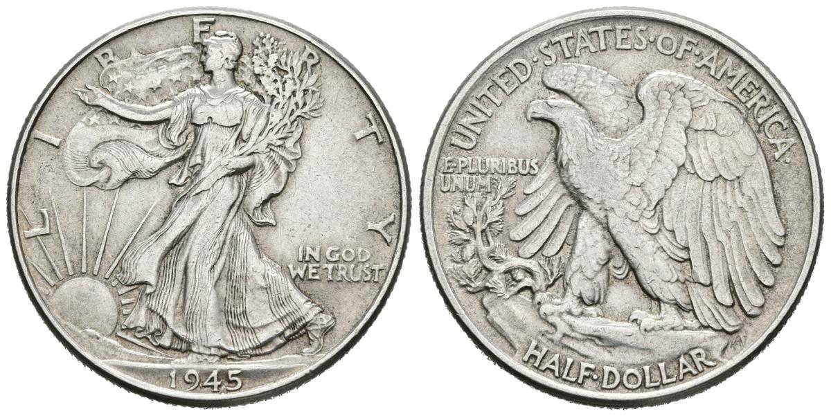 English U.S. 1/2 Dollar. (Ar. 12.54g / 30mm). 1945. Philadelphia. (Km # 142). VF.