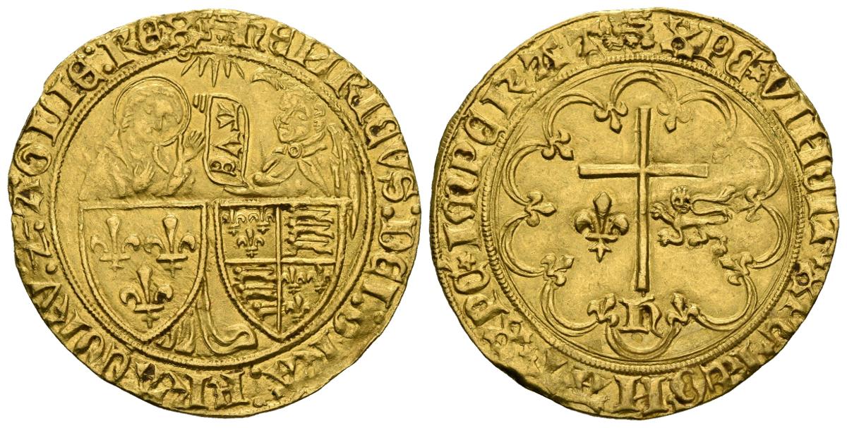 FRANCE, Henry IV of Lancaster (1422-1453). Salut de Oro. (Au. 3.49g / 26mm). Rouen. Anv: HENRICVS DEI GRA FRACORV Z AGLIE REX. The Virgin shelf on the right receiving tablet with the AVG inscription of the Angel Gabriel shelf on the right, under both shields. Rev: XPC VINCIT XPC REGNAT XPC IMPERAT. Latin cross between fleur-de-lis and lion, below H, all within ten arches. (Duplessy 443A). AU. Beautiful and rare specimen minted in France in honor of the King of France and England born in Lancaster.