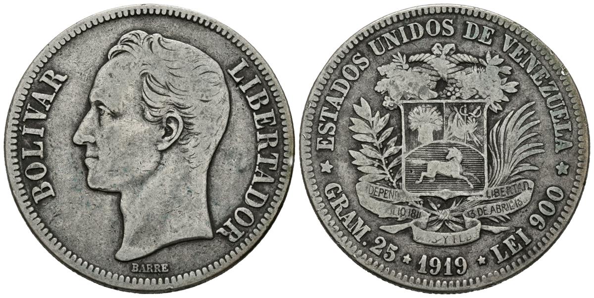 UNITED STATES OF VENEZUELA. 5 Bolivars. (Ar. 24.59g / 37mm). 1919. Caracas. (Km # Y24.2). VG.