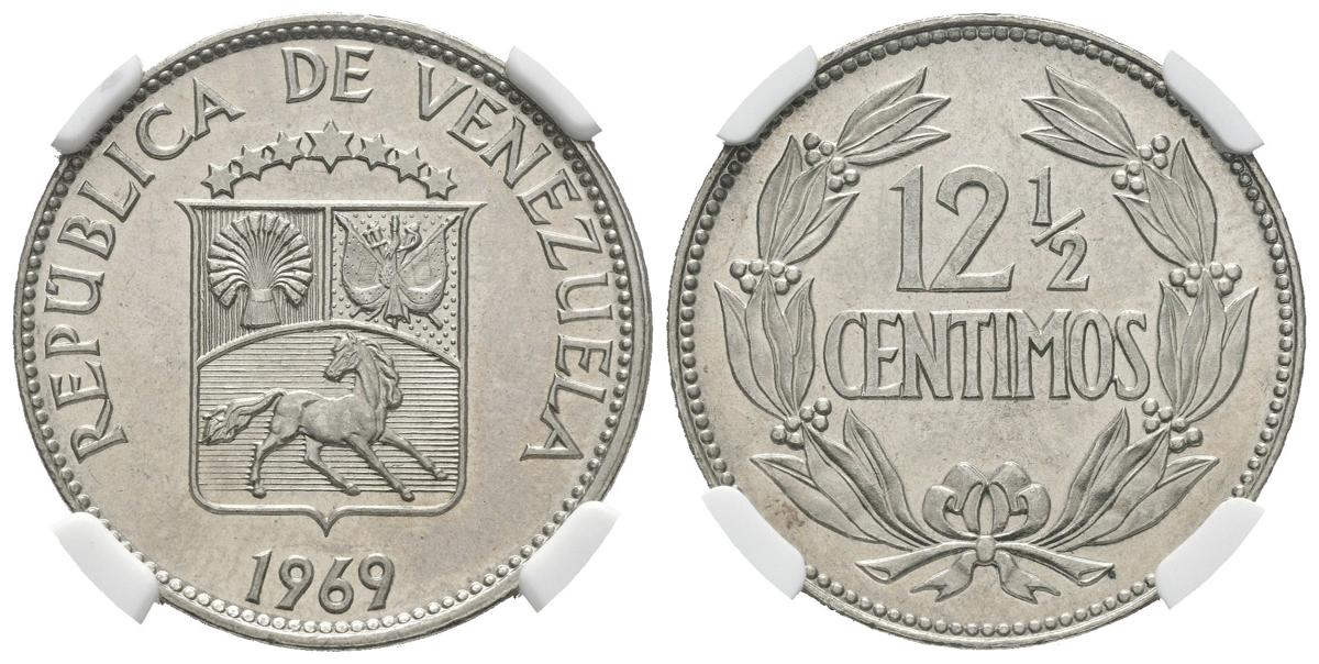 REPUBLIC OF VENEZUELA. 12 1/2 Cents. (CuNi. 5.00g / 23mm). 1969. Philadelphia. (Km # Y39.1). NGC MS-65 package.