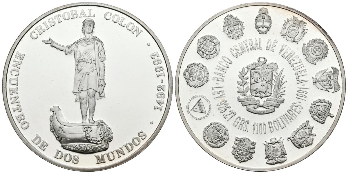 REPUBLIC OF VENEZUELA. 1100 Bolívares (Ar. 27.01g / 40mm). 1991. Encounter between two worlds. (Km # Y68). PROOF. Only 10,000 minted copies.