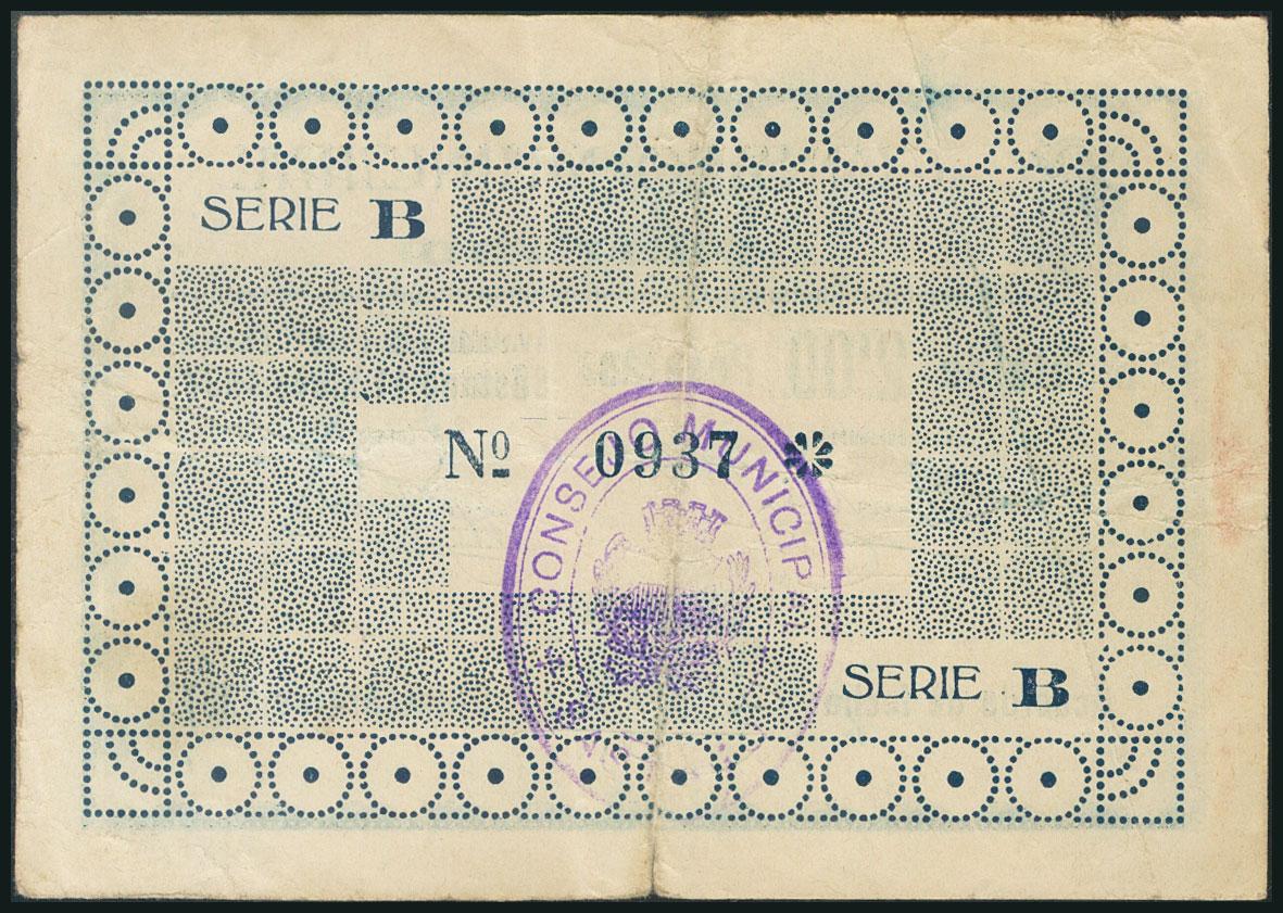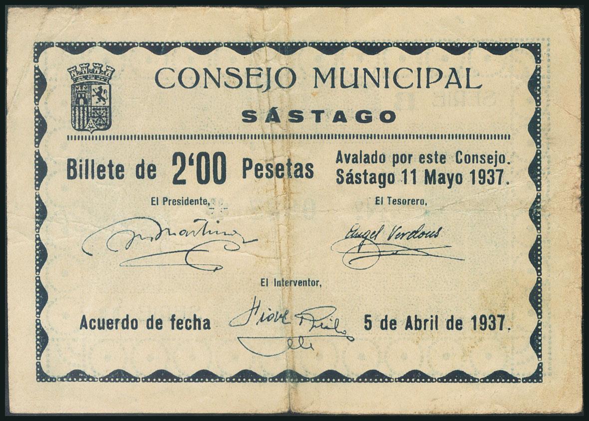 English SASTAGO (ZARAGOZA). 2 Pesetas. May 11, 1937. Series B. (González: 4795). Rare. VG.