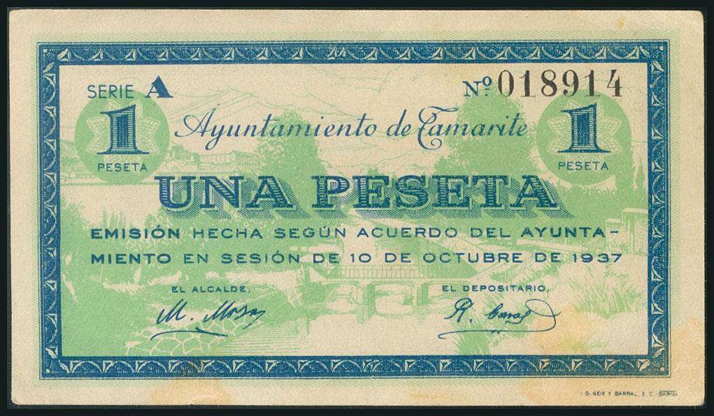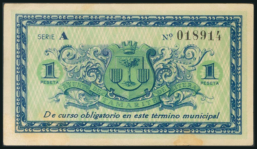 TAMARITE DE LITERA (HUESCA). 1 peseta. October 10, 1937. Series A. (González: 4974). AU.