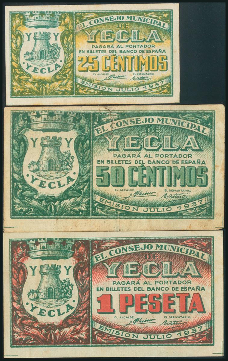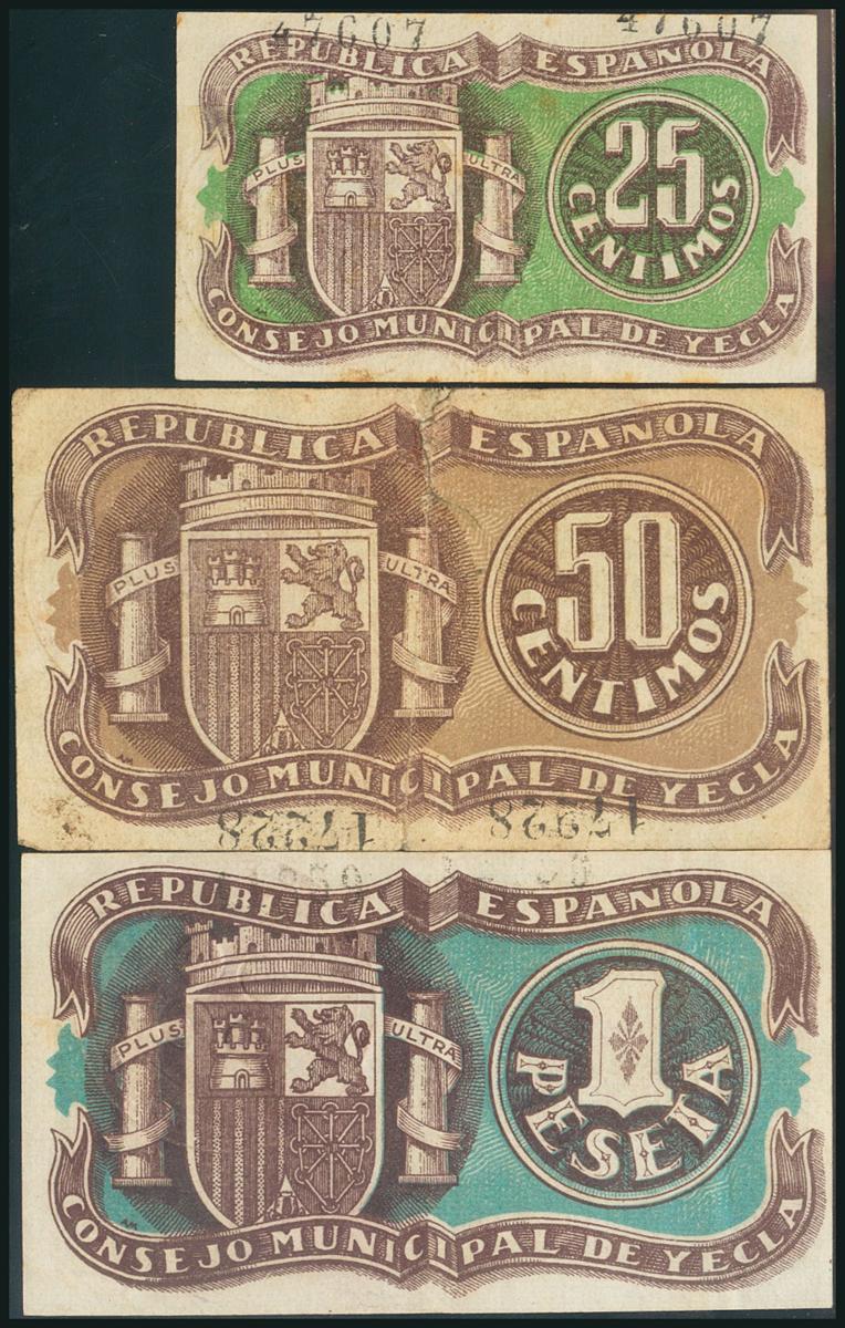 English YECLA (MURCIA). 25 Cents, 50 Cents and 1 Peseta. June 1937. (González: 5807/09). Unusual complete series. VF.