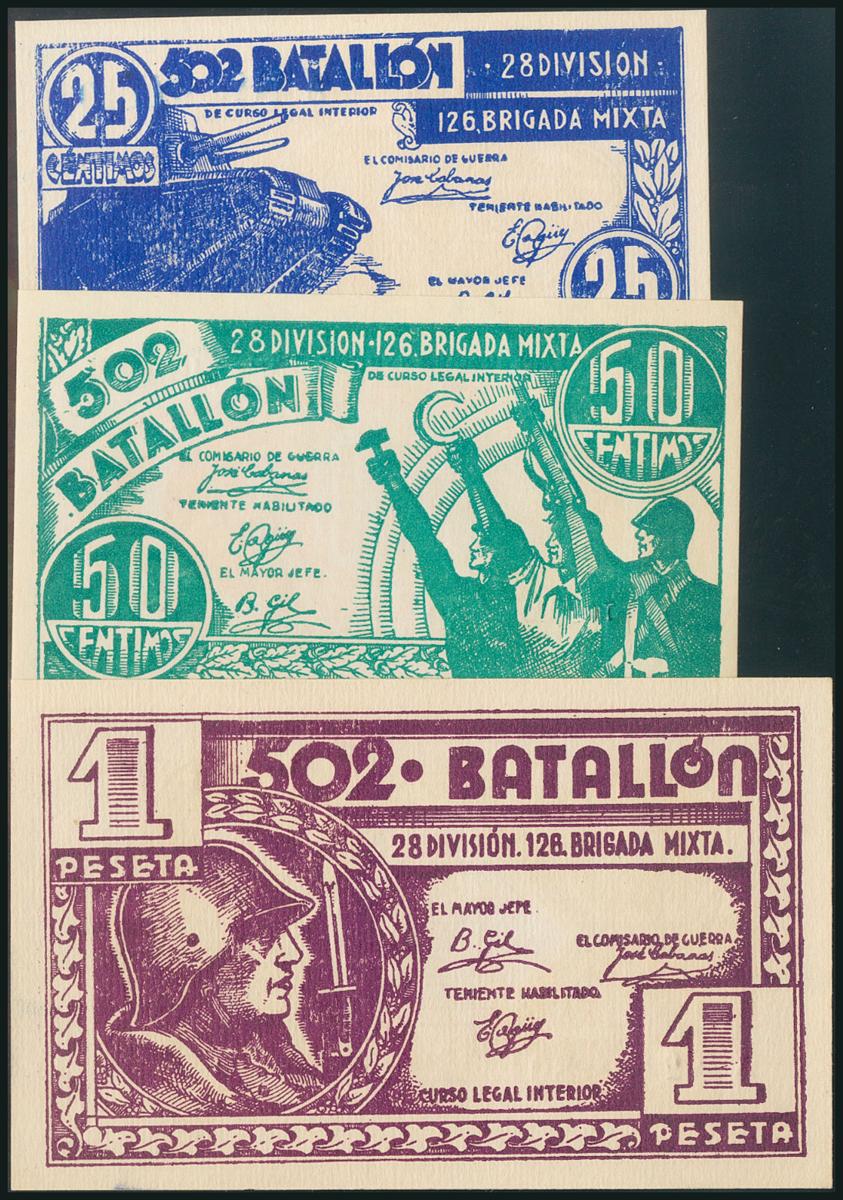 English MILITARY TICKET-502 BATALLON. Complete series of the Mixed Brigade. 25 Cents, 50 Cents and 1 Peseta. (1937ca). Series A. (González: 5876/78). Rare. UNC.