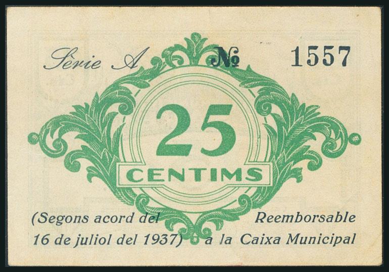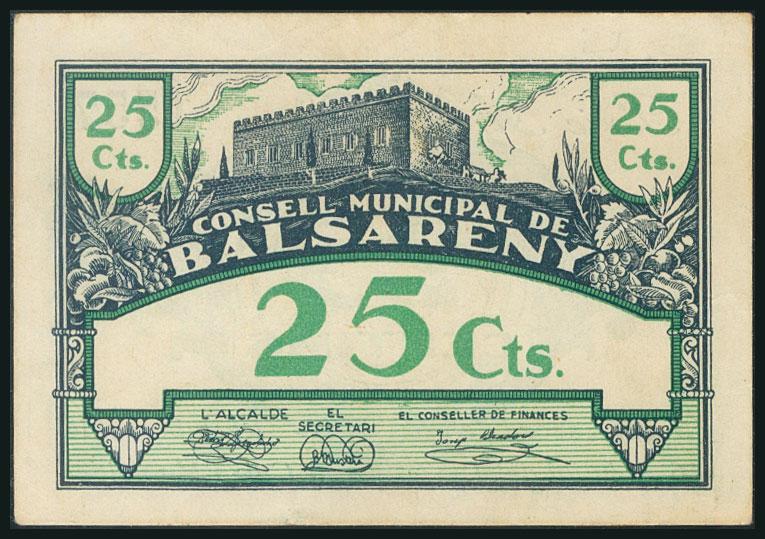 BALSARENY (BARCELONA). 25 cents. July 16, 1937. Series A. (González: 6497). AU.