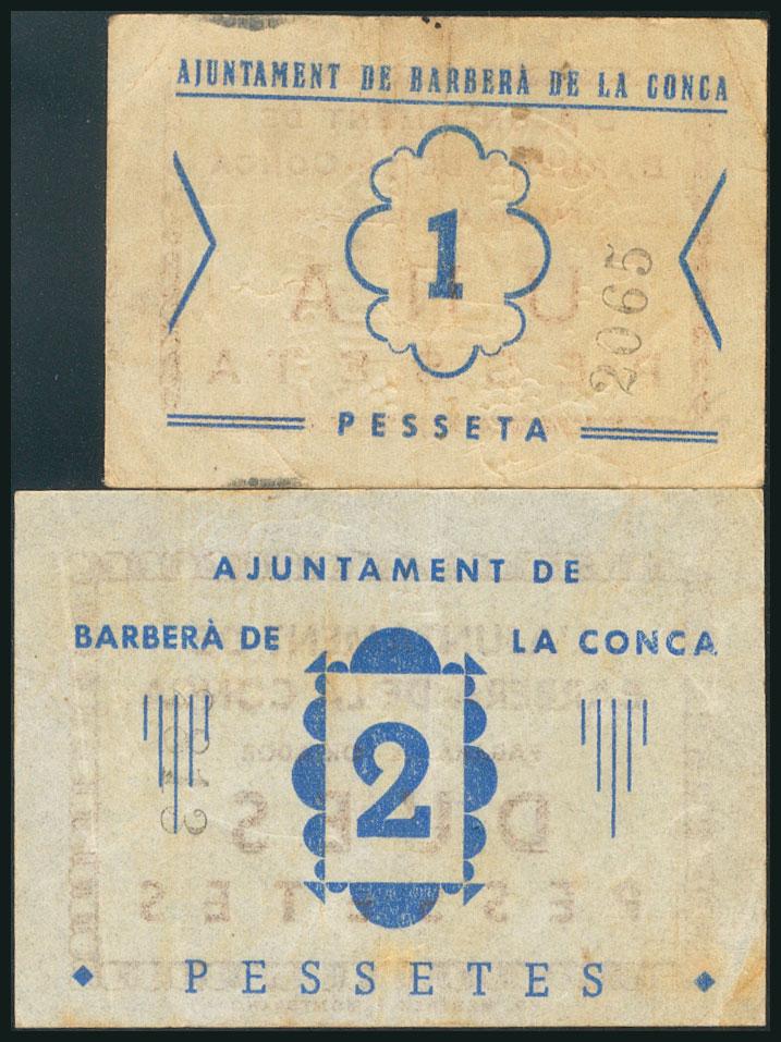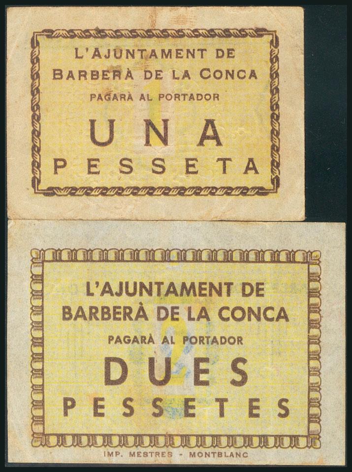 BARBERA DE LA CONCA (TARRAGONA). 1 Peseta and 2 Pesetas. (1938ca). (González: 6515/16). Very rare complete series. VF.