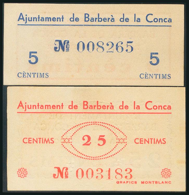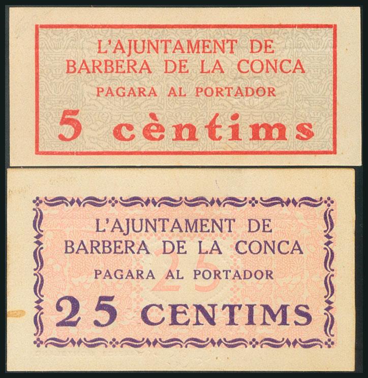 BARBERA DE LA CONCA (TARRAGONA). 5 Cents and 25 Cents. (1937ca). (González: 6517/18). Rare complete series. AU.