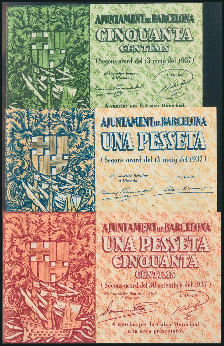 English BARCELONA. 50 Cents, 1 Peseta and 1´50 Pesetas. May 13, 1937 and September 30, 1937. Series B, C and A, respectively. (González: 6520, 6521 and 6522). UNC.