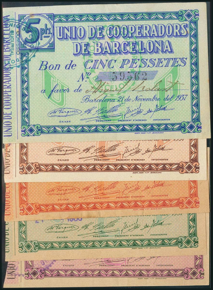 BARCELONA. 5 Pesetas. November 21, 1937. Without series, series A, B, C and D, respectively. (González: 6883/87). Rare complete series. UNC/ XF.