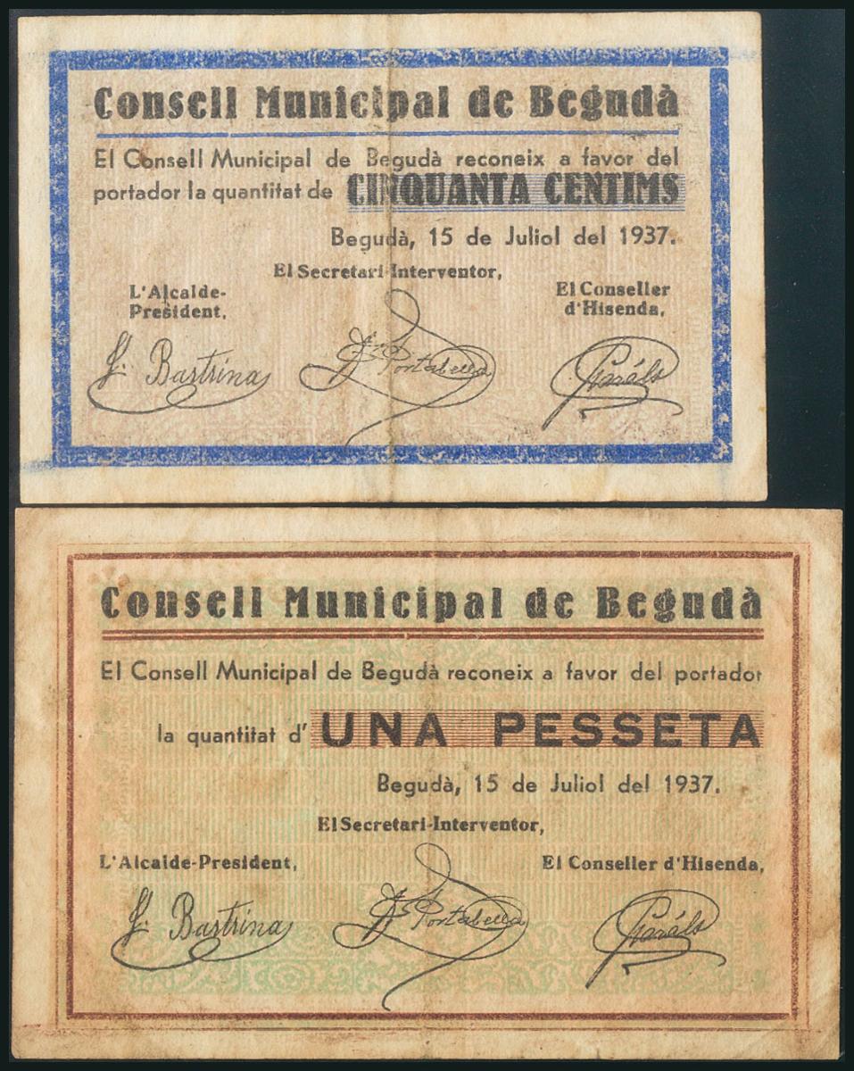 English BEGUDA (GERONA). 50 Cents and 1 Peseta. July 15, 1937. Series B and A, respectively. (González: 6926/27). Rare complete series. F.