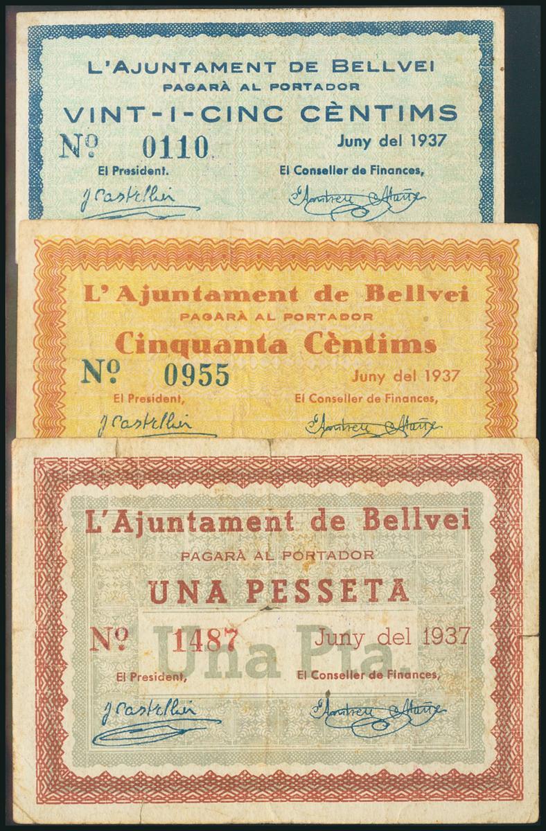 English BELLVEI DEL PENEDES (TARRAGONA). 25 Cents, 50 Cents and 1 Peseta. June 1937. (González: 6998, 6999, 7001). Rare AU/ F.