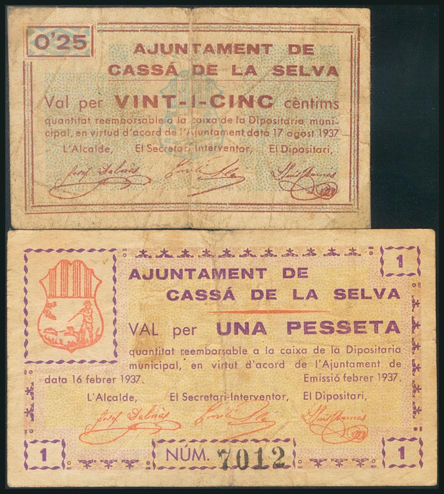 CASSA DE LA SELVA (GERONA). 25 Cents and 1 Peseta. August 17, 1937 and February 16, 1937. (González: 7408, 7409). BC + / FR2.