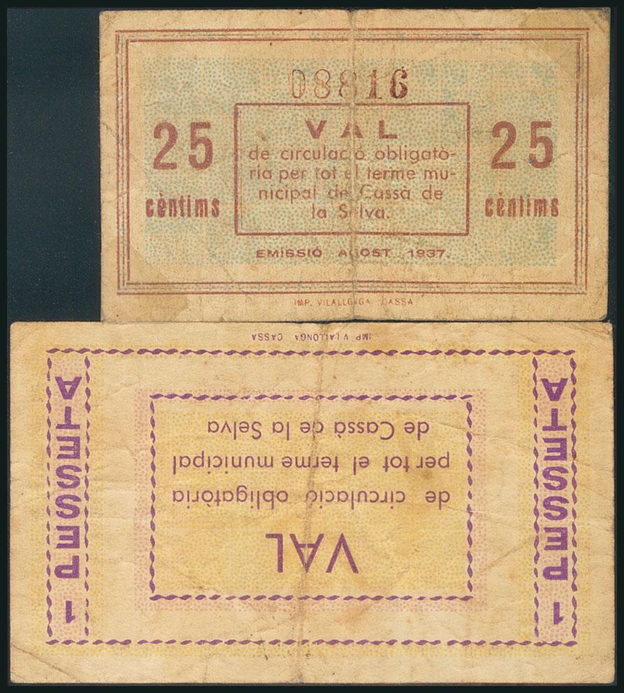 CASSA DE LA SELVA (GERONA). 25 Cents and 1 Peseta. August 17, 1937 and February 16, 1937. (González: 7408, 7409). BC + / FR2.