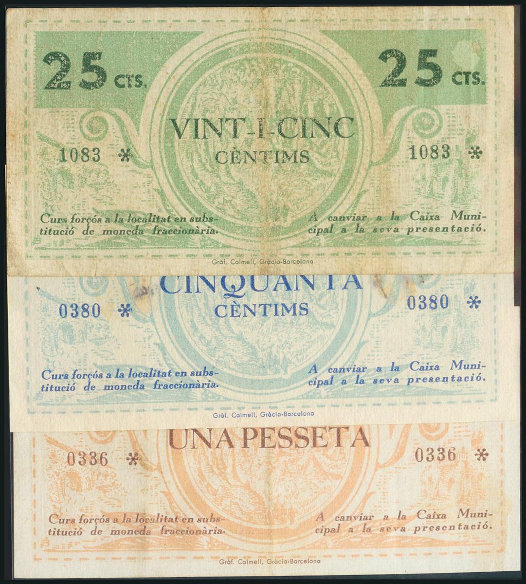 COLLBATO (BARCELONA). 25 Cents, 50 Cents and 1 Peseta. (1938ca). (González: 7632/34). Very rare complete series. XF.