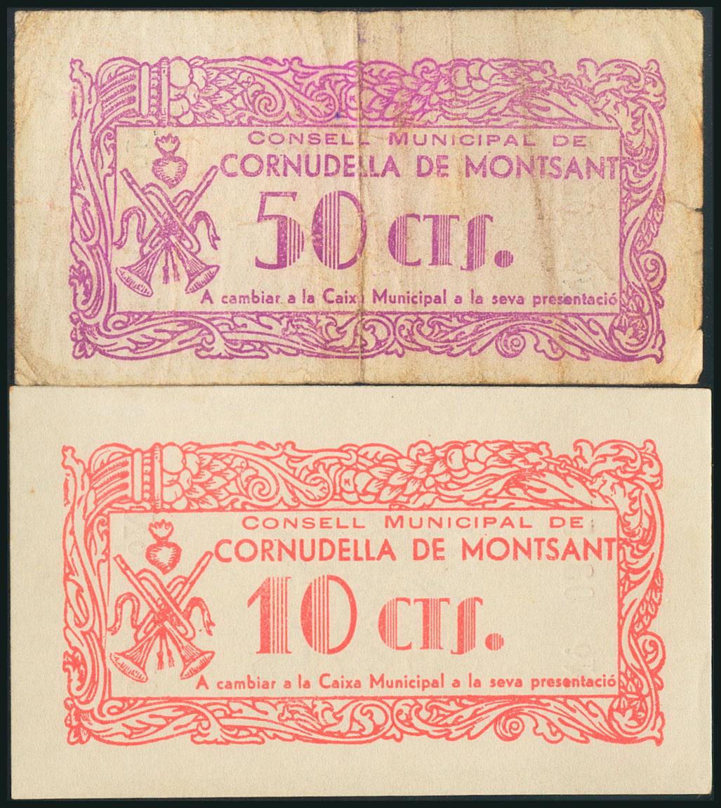 English CORNUDELLA DE MONTSANT (TARRAGONA). 10 Cents and 50 Cents. (1938ca). (González: 7696, 7698). Very rare. UNC/ G.