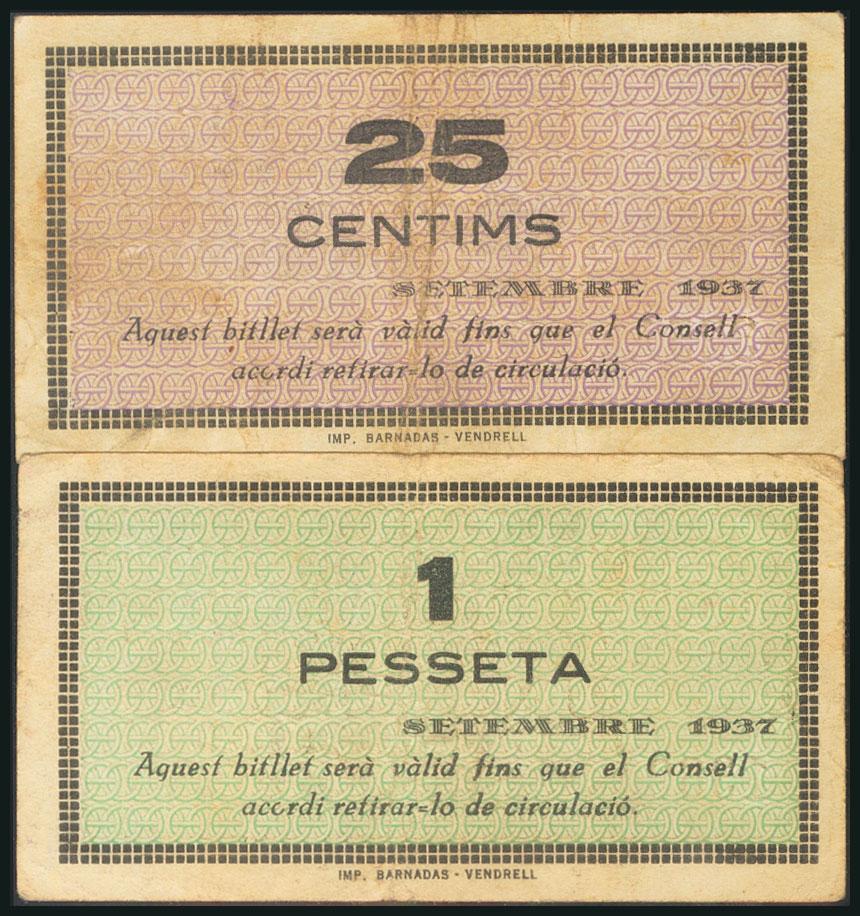 DOMENYS DEL PENEDES (TARRAGONA). 25 Cents and 1 Peseta. September 1937. (González: 7715/16). Complete series. F.