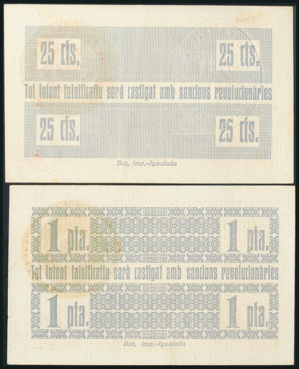ESPARREGUERA (BARCELONA). 25 Cents and 1 Peseta. March 1937. (González: 7744, 7747). UNC.