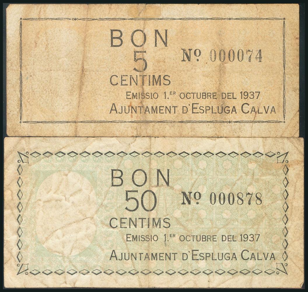 CALVA SPLUGE (LERIDA). 5 Cents and 50 Cents. October 1937. (González: 7765, 7768). Very rare. G/ F.