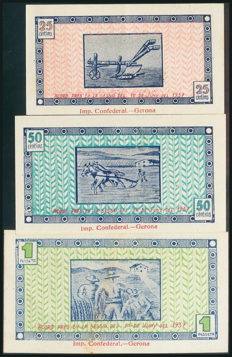 JUIA (GERONA). 25 Cents, 50 Cents and 1 Peseta. June 1, 1937. (González: 8287/89). Rare complete series. AU.