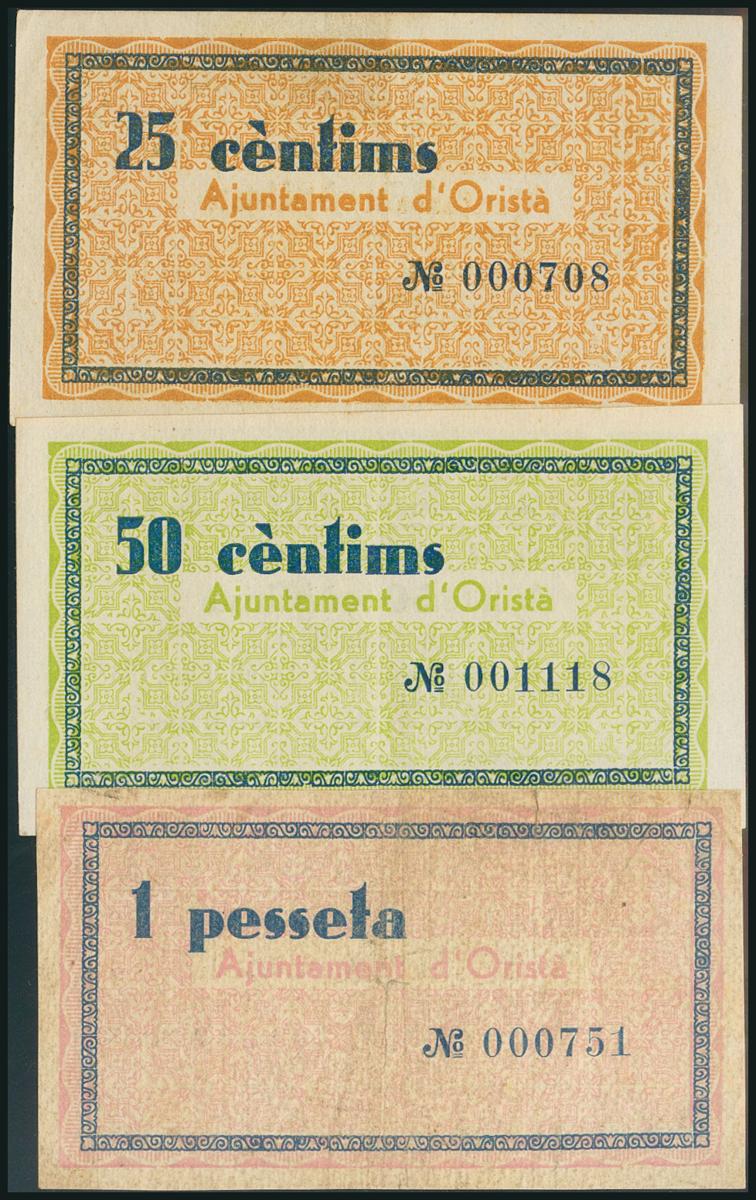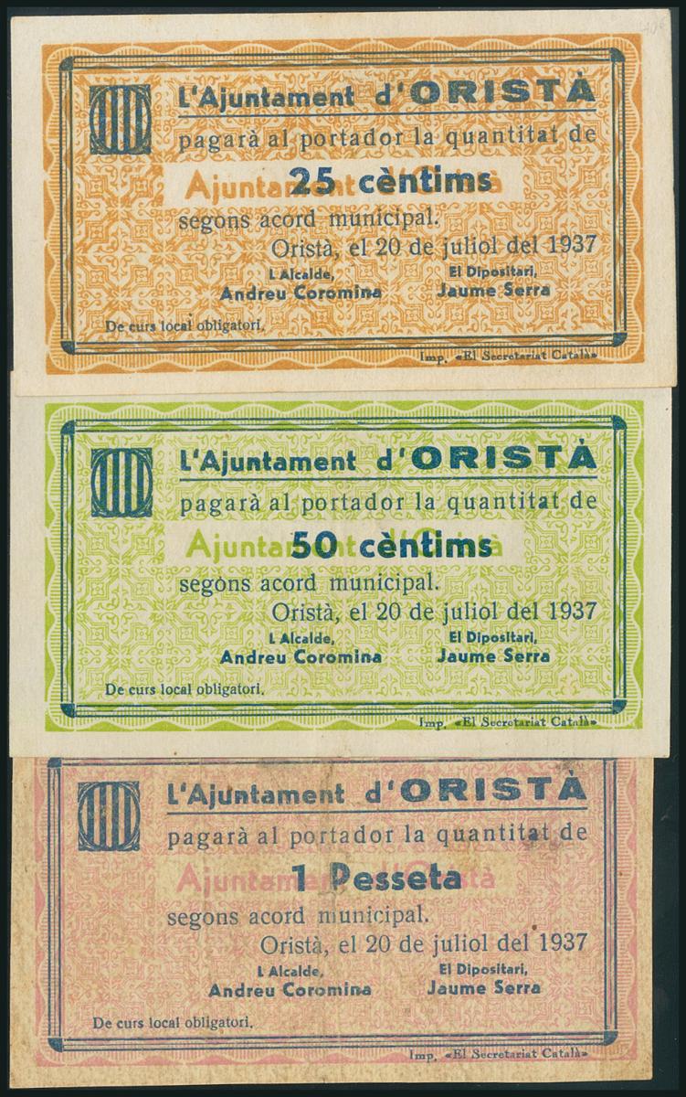 ORISTA (BARCELONA). 25 Cents, 50 Cents and 1 Peseta. July 20, 1937. (González: 9046/48). Very rare series. AU/ VF.