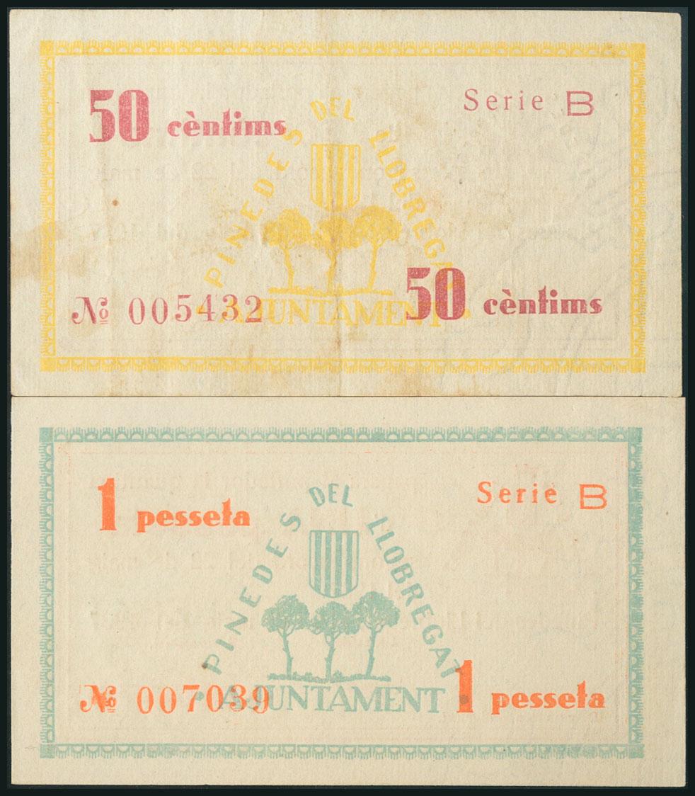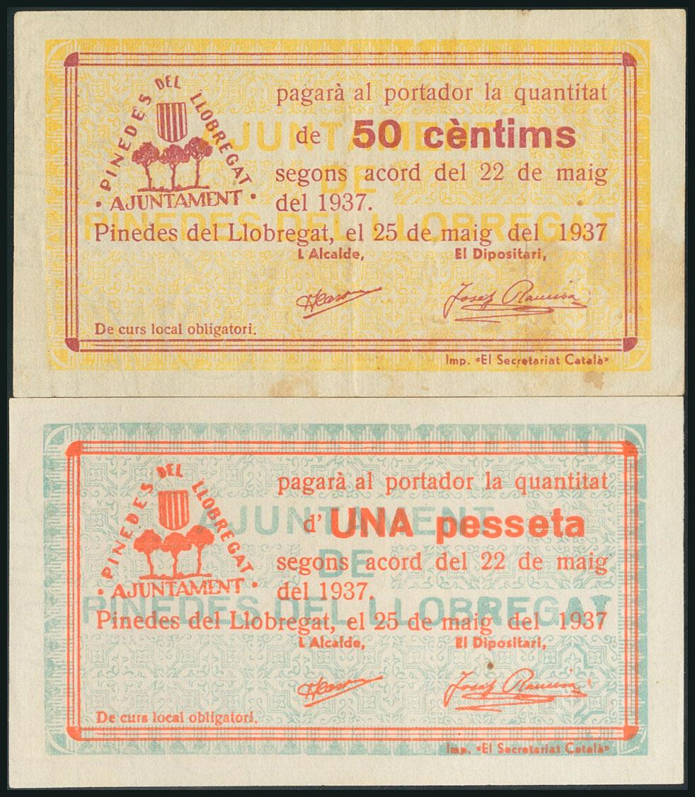 PINEDES DEL LLOBREGAT (BARCELONA). 50 Cents and 1 Peseta. May 1937. Series B, both. (González: 9229/30). Unusual complete series. XF/ UNC.