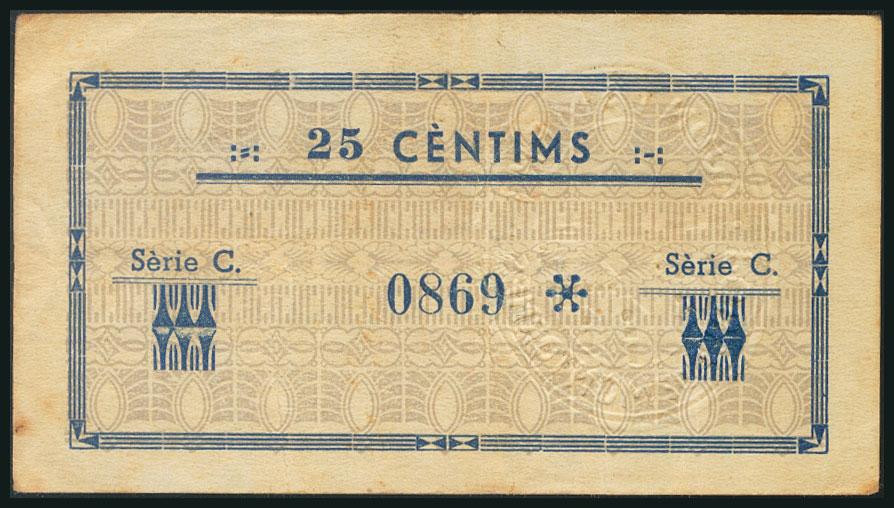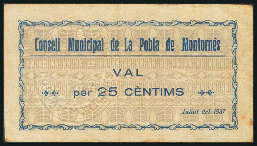 LA POBLA DE MONTORNES (TARRAGONA). 25 cents. July 1937. (González: 9331). Very rare. VF.