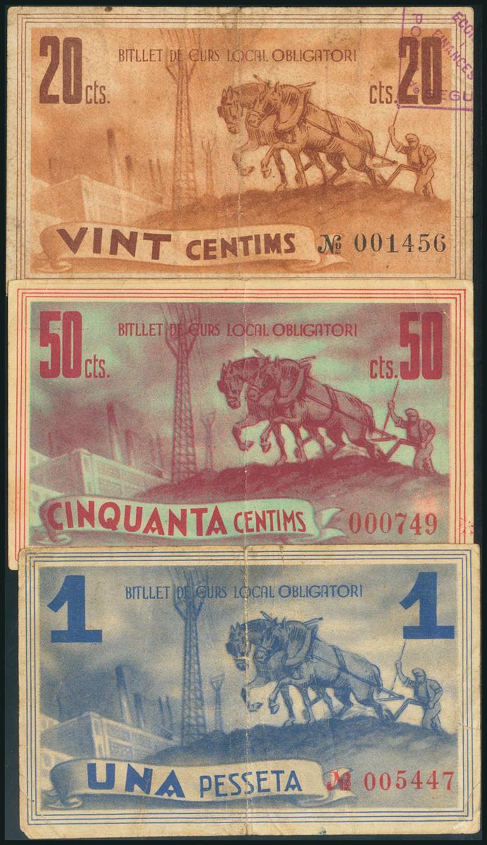 POBLA DE SEGUR (LERIDA). 20 Cents, 50 Cents and 1 Peseta. July 6, 1937. (González: 9339/41). Complete series. F.