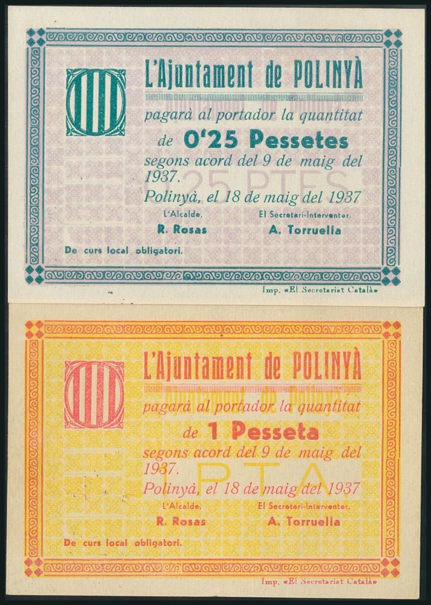 POLINYA (BARCELONA). 25 Cents and 1 Peseta. May 18, 1937. (González: 9360, 9361). Rare UNC/ AU.