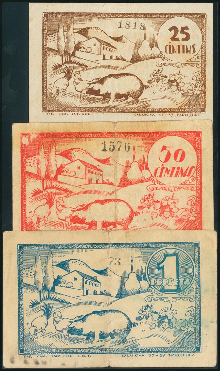 PRATS DE LLUÇANES (BARCELONA). 25 Cents, 50 Cents and 1 Peseta. May 10, 1937. (González: 9439/41). Complete series. F.