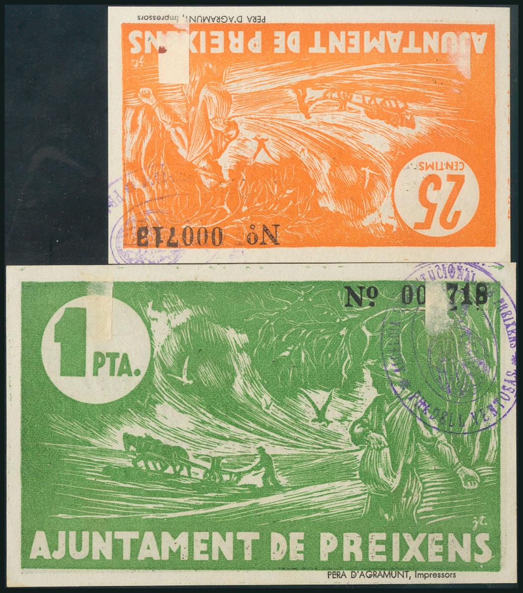 PREIXENS (LERIDA). 25 Cents and 1 Peseta. (1938ca). (González: 9449/50). Very rare complete series, also in exceptional quality. AU.