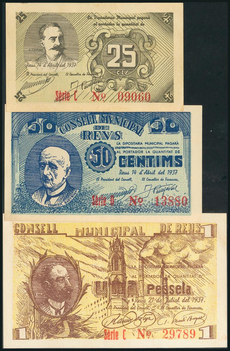 REUS (TARRAGONA). 25 Cents, 50 Cents and 1 Peseta. April 14, 1937. Series C (2) and D, respectively. (González: 9550, 9557, 9562). UNC/ XF.