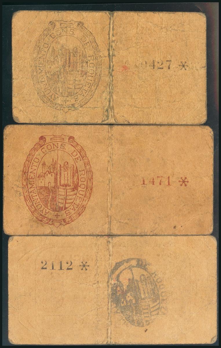 English ROQUETAS (TARRAGONA). 25 Cents, 50 Cents and 1 Peseta. (1937ca). (González: 9730, 9732, 9733). Rare G.