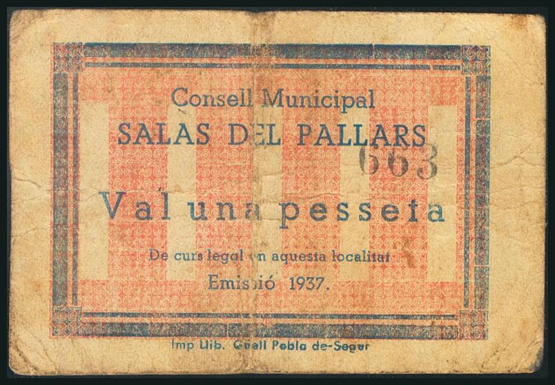 English SALAS DEL PALLARS (LERIDA). 1 peseta. 1937. (González: 9815). Rare. BC +.