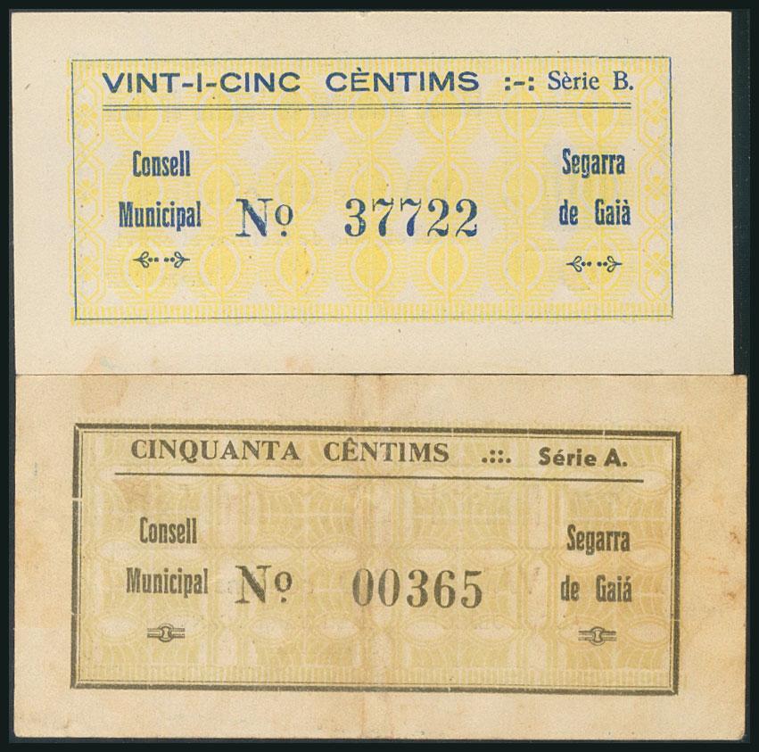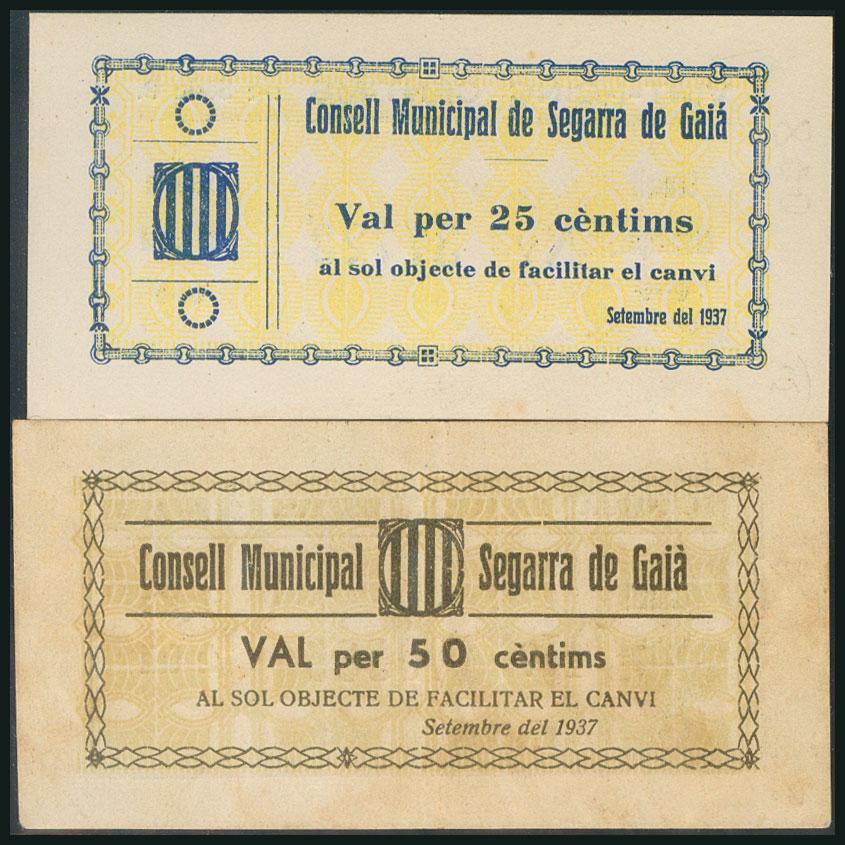 English SEGARRA DE GAIA (TARRAGONA). 25 Cents and 50 Cents. September 1937. Series B and A, respectively (González: 9911/12). Unusual complete series. UNC/ AU.