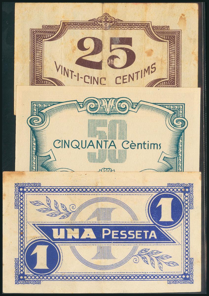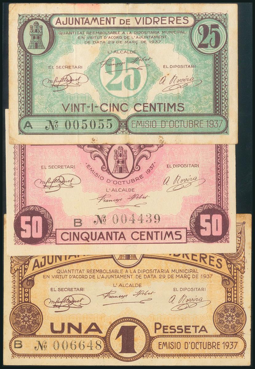 VIDRERES (GERONA). 25 Cents, 50 Cents and 1 Peseta. October 1937. Series A and B (2), respectively. (González: 10648/50). Rare complete series. F/ AU.