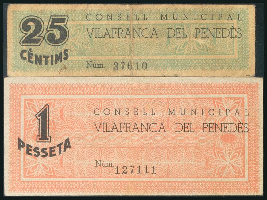 VILAFRANCA DEL PENEDES (BARCELONA). 25 Cents and 1 Peseta. April 1, 1937. (González: 10708/09). AU/ BC +.