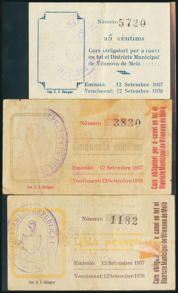 VILANOVA DE MEIA (LERIDA). 25 Cents, 50 Cents and 1 Peseta. July 12, 1937. (González: 10815/17). Rare complete series. VF.