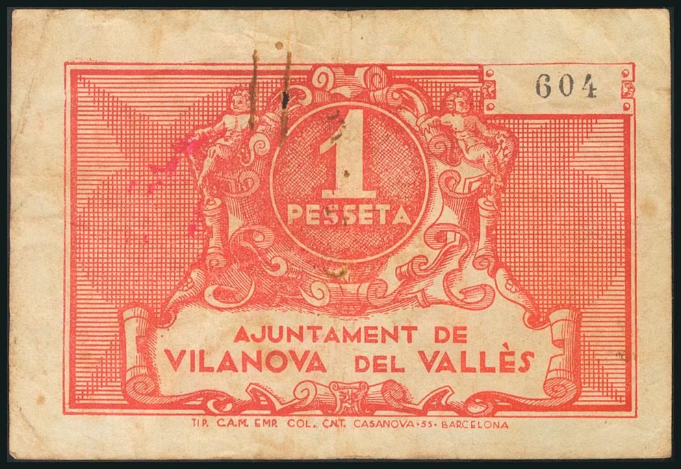 VILANOVA DEL VALLES (BARCELONA). 1 peseta. (1938ca). (González: 10830). Rare. BC +.