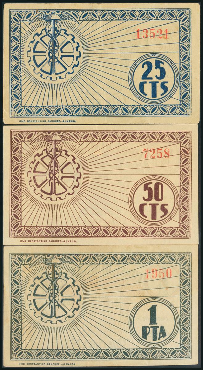 English CHINCHILLA (ALBACETE). 25 Cents, 50 Cents and 1 Peseta. (1938ca). (González: 1921/23). Unusual complete series. AU/ XF.