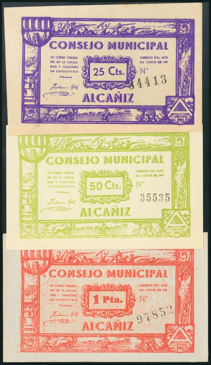 ALCAÑIZ (TERUEL). 25 Cents, 50 Cents and 1 Peseta. This series belongs to a publisher that reprinted them with posterity. UNC/ UNC.