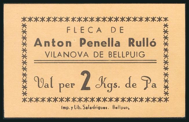 2 Kilos of bread voucher from Anton Penella Rulló, from Vilanova de Bellpuig, from Lérida. UNC.